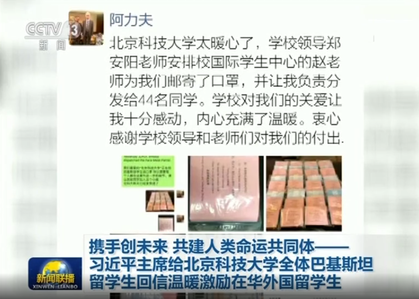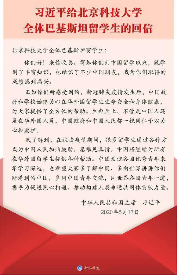 2020年5月17日,北京科技大學(xué)全體巴基斯坦留學(xué)生收到了習(xí)近平總書記的重要回信。習(xí)總書記在回信中對(duì)北科中外學(xué)子患難與共的真情表示欣慰,并對(duì)廣大留學(xué)生及中國(guó)青年提出殷切期盼,希望各國(guó)青年攜手為促進(jìn)民心相通、推動(dòng)構(gòu)建人類命運(yùn)共同體貢獻(xiàn)力量。