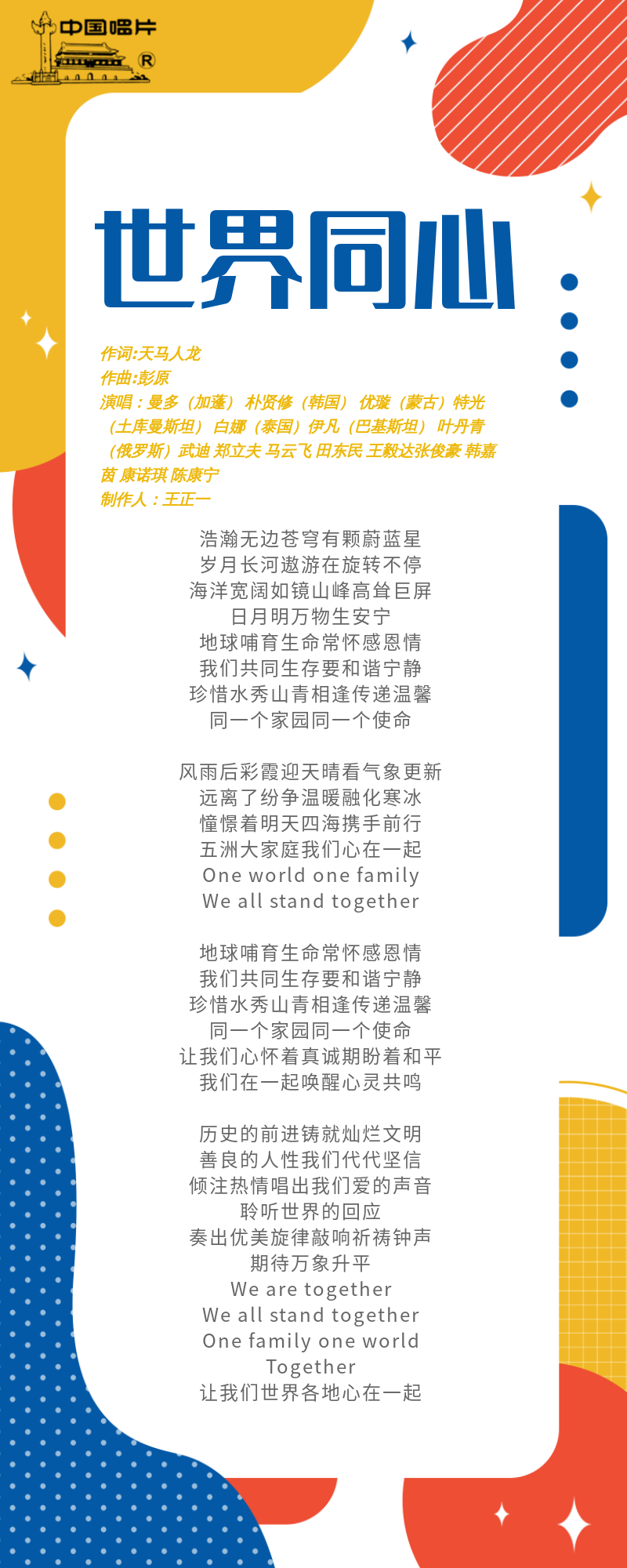 浩瀚的蒼穹有一顆蔚藍(lán)的星,它在歲月長(zhǎng)河中旋轉(zhuǎn)不停,地球母親哺育了萬(wàn)物,我們同一個(gè)家園,同一個(gè)使命。讓我們心在一起,相逢傳遞溫馨,遠(yuǎn)離紛爭(zhēng),用溫暖融化寒冰,敲響祈禱和平的鐘聲,用愛(ài)的聲音呼喚世界的共鳴,人類一個(gè)大家庭,憧憬著美好的明天,五洲四海攜手前行,世界同心。
