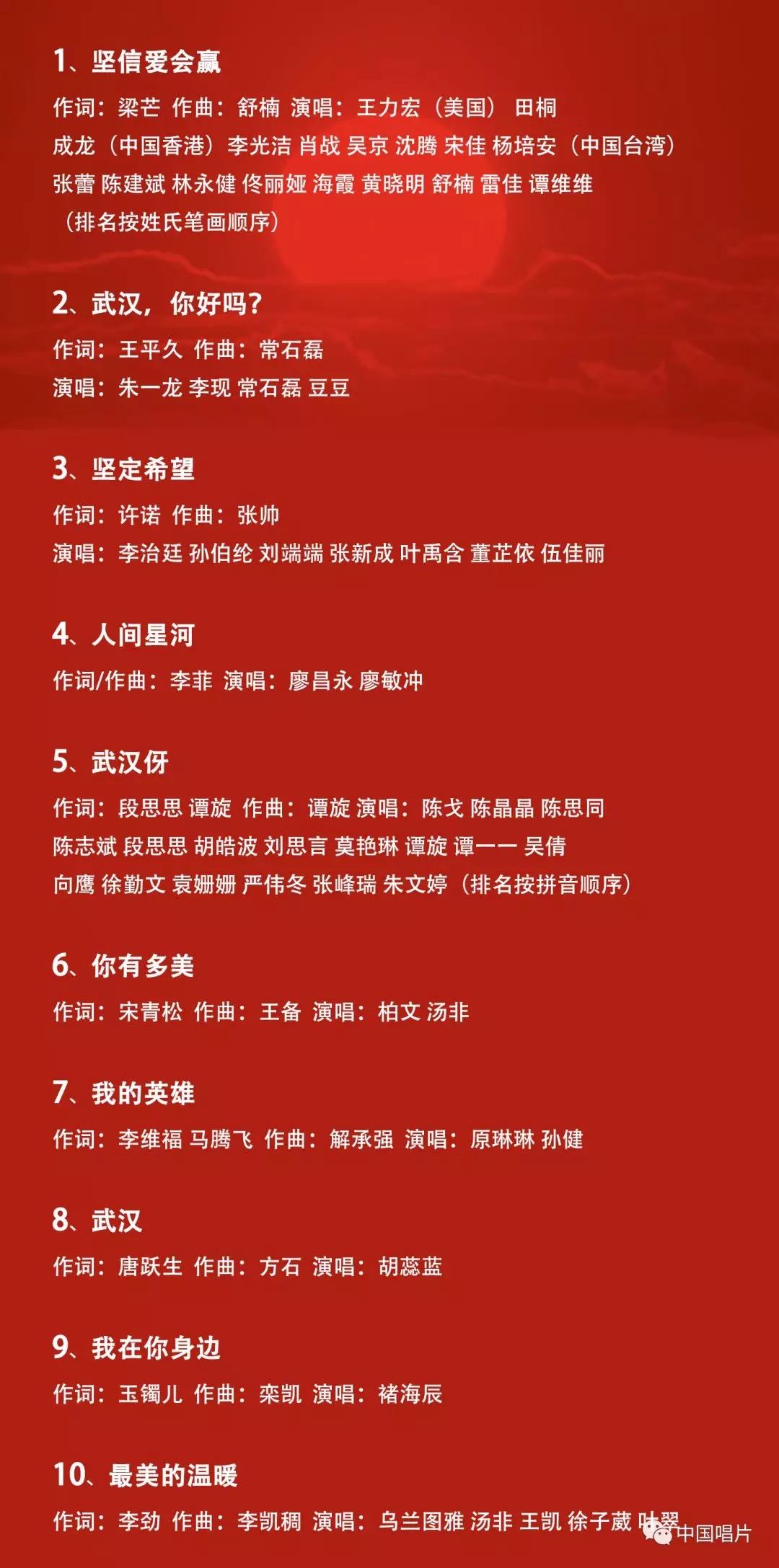 《情系武漢 大愛中國》全媒體專輯秉承“文藝作品為人民而作,為時(shí)代鑄魂”的原則,首批精選抗疫優(yōu)秀主題歌曲10首。