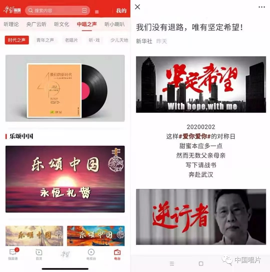 2020年的春節(jié),突如其來的疫情打亂了人們匆匆回鄉(xiāng)的腳步。在全國人民守望相助、眾志成城,盼望早日共渡難關(guān)的重要時(shí)刻,中唱集團(tuán)旗下中國唱片(上海)有限公司聯(lián)合中宣部“學(xué)習(xí)強(qiáng)國”平臺(tái)、新華通訊社“聲在中國”共同推出《情系武漢 大愛中國》抗疫優(yōu)秀歌曲系列全媒體公益出版專題項(xiàng)目。