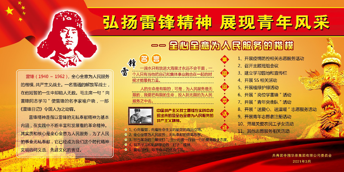 2021年3月5日是第58個(gè)全國(guó)學(xué)雷鋒紀(jì)念日,也是第22個(gè)中國(guó)青年志愿服務(wù)日。為推進(jìn)學(xué)雷鋒志愿服務(wù)常態(tài)化,進(jìn)一步在全社會(huì)營(yíng)造向上向善、互幫互助的良好風(fēng)尚,華錄集團(tuán)團(tuán)委以“弘揚(yáng)雷鋒精神 展現(xiàn)青年風(fēng)采”為主題,以“助力生產(chǎn)、親情關(guān)愛、文化服務(wù)、生態(tài)保護(hù)、平安建設(shè)、弘揚(yáng)新風(fēng)”等為主要內(nèi)容,組織廣大團(tuán)員青年開展形式多樣的學(xué)雷鋒志愿服務(wù)活動(dòng),廣泛傳播“奉獻(xiàn)、友愛、互助、進(jìn)步”的志愿精神。
