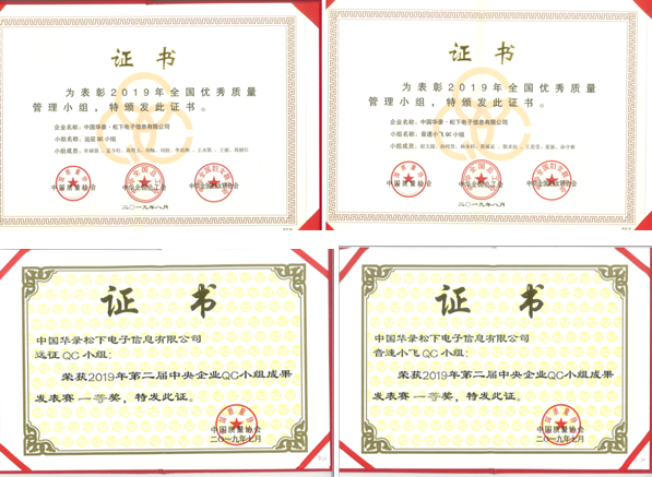 2019年7月16-18日,在北京舉行的第二屆中央企業(yè)質(zhì)量成果發(fā)表(QC小組)大賽上,由華錄集團(tuán)選送的華松公司“音速小飛QC小組”和“遠(yuǎn)征QC小組”獲得現(xiàn)場發(fā)表賽一等獎(jiǎng),8月27日在中質(zhì)協(xié)成立40周年紀(jì)念大會上被評為“全國優(yōu)秀質(zhì)量管理小組”并頒發(fā)榮譽(yù)證書。