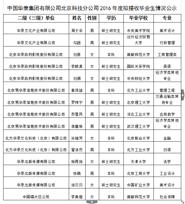 于中國華錄集團(tuán)有限公司在京單位2016年度高校畢業(yè)生擬接收情況公示