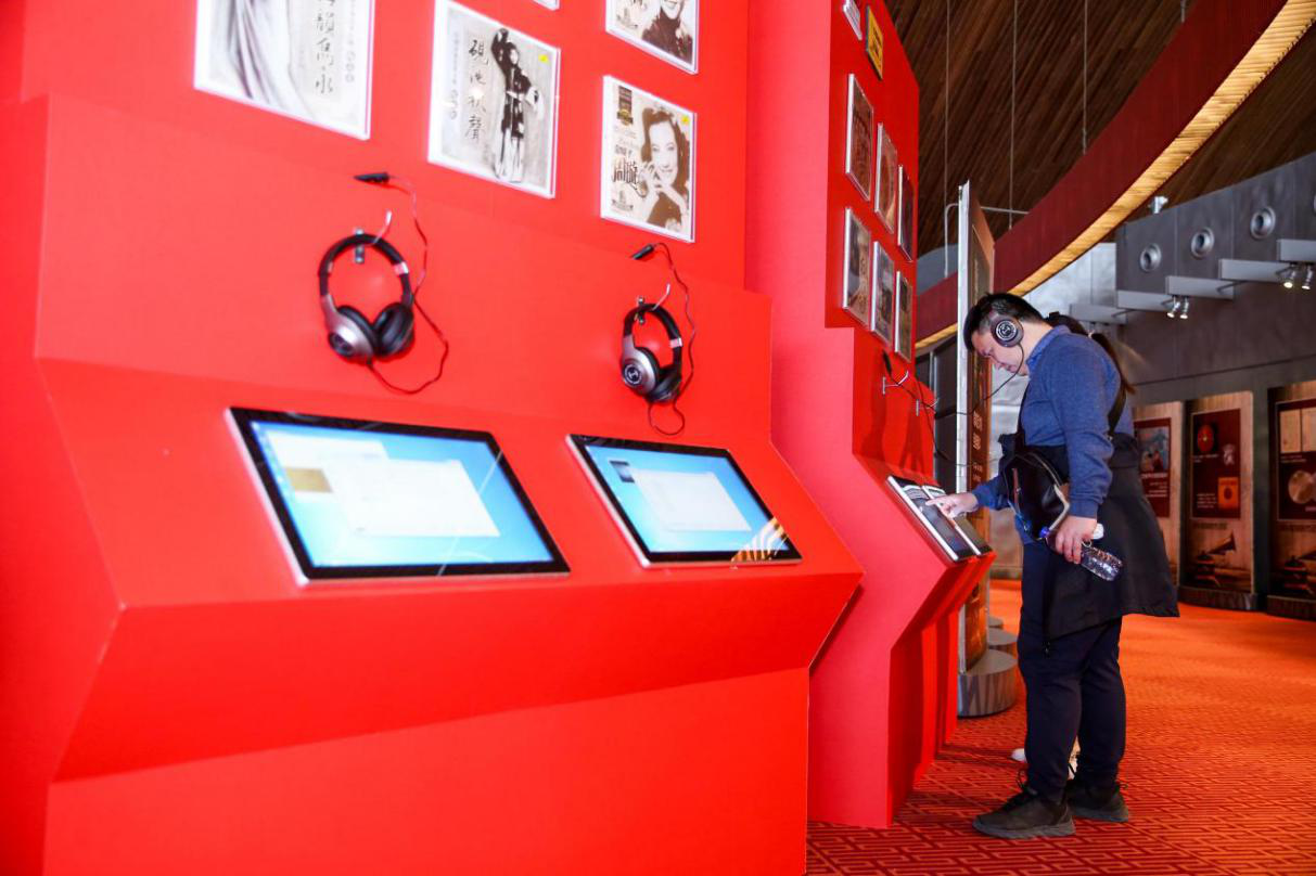 “唱支山歌給黨聽”多媒體試聽互動打卡區(qū)許多觀眾流連忘返,駐足聆聽經典旋律,沉浸其中,回溫百年崢嶸歲月。